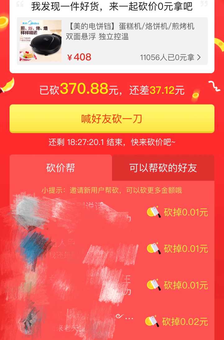 看到有时间限制挺着急的,不是多想要这个,但是这么多精力花进去了就想要一个成果,所以还加了一个拼多多qq群,需要花钱进的那种2元,里面的人绝对不会帮你砍!而且他们都是老用户砍出来都很少,看到多少钱还要转红包,总之很坑。还花了两块多在老乡群里求帮砍,十个人领了只有两个人砍了,!!新时代啊诚信啊!(微信里分享要下app,qq里好像关注就能砍,所以在qq里发动的陌生人)