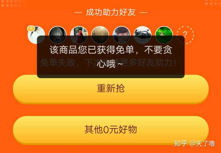 按他的要求找了五个助力好友,好不容易在规定时间内找到了,显示失败,后来莫名其妙又成功了,订单还在确认中,确认着确认着就又失败了,重点!!!!是失败我重新抢嘛,然后他显示“该商品您已获得免单,起,请不要贪心” 我还能说什么呢,一会成功一会失败,失败又说你获得该商品的免单了,而且这个商品是五人助理就好了的,界面上又显示需要7人,我……真不知道该怎么吐槽了……