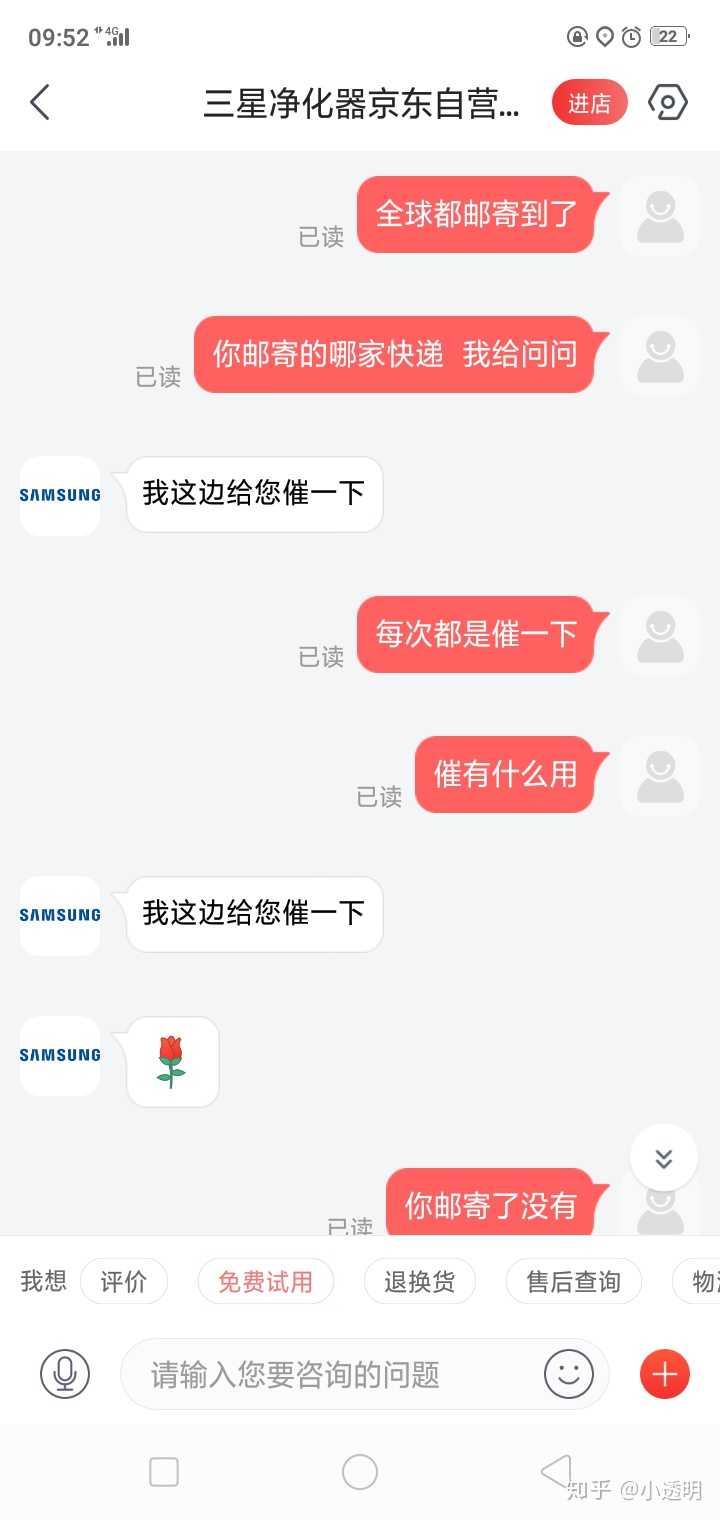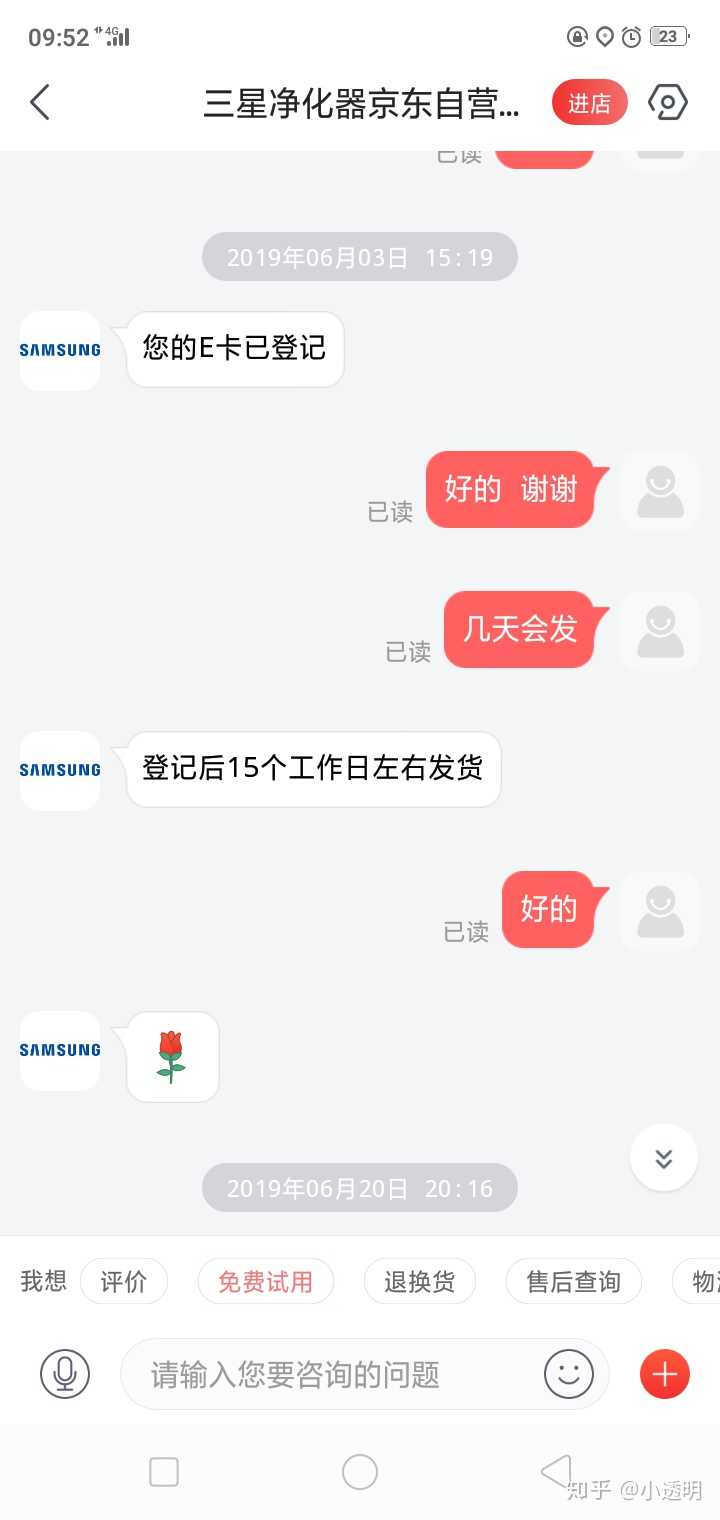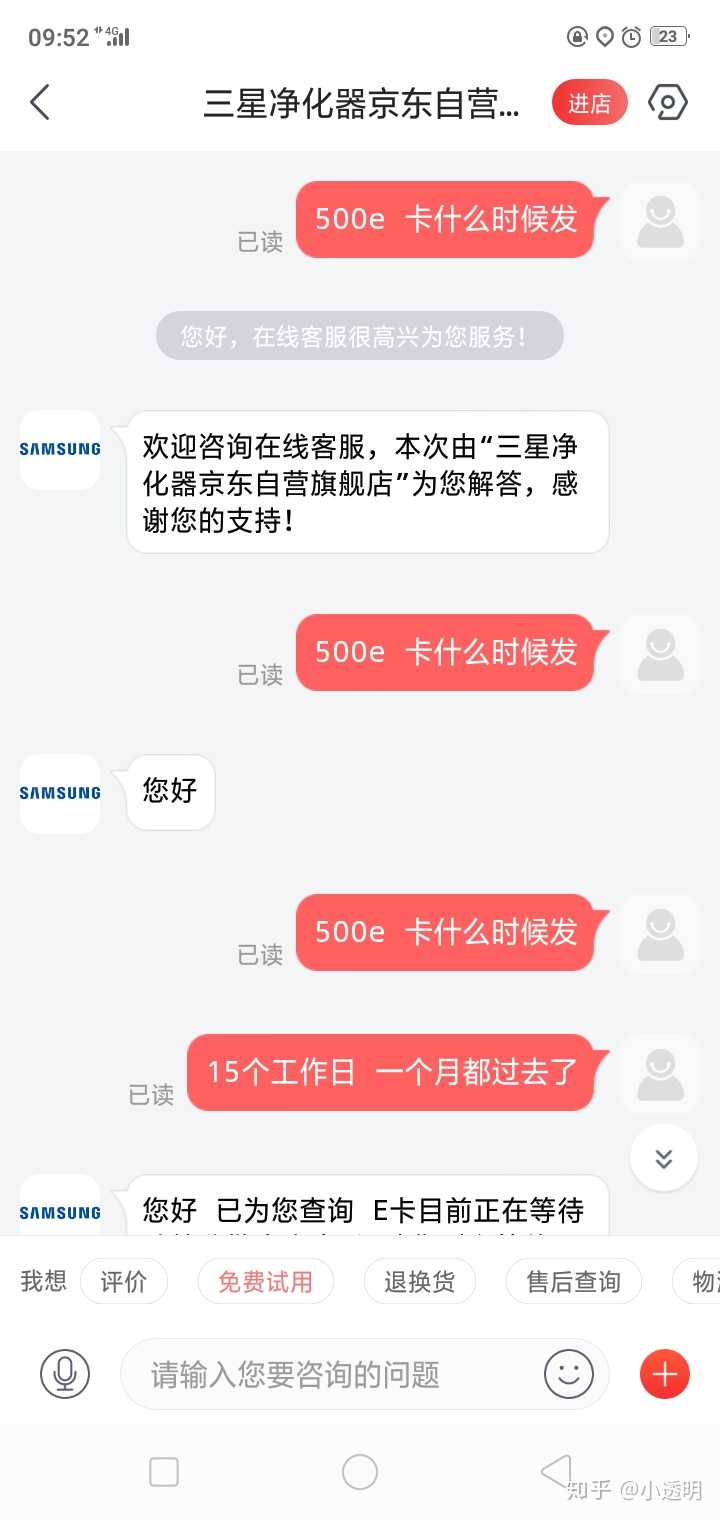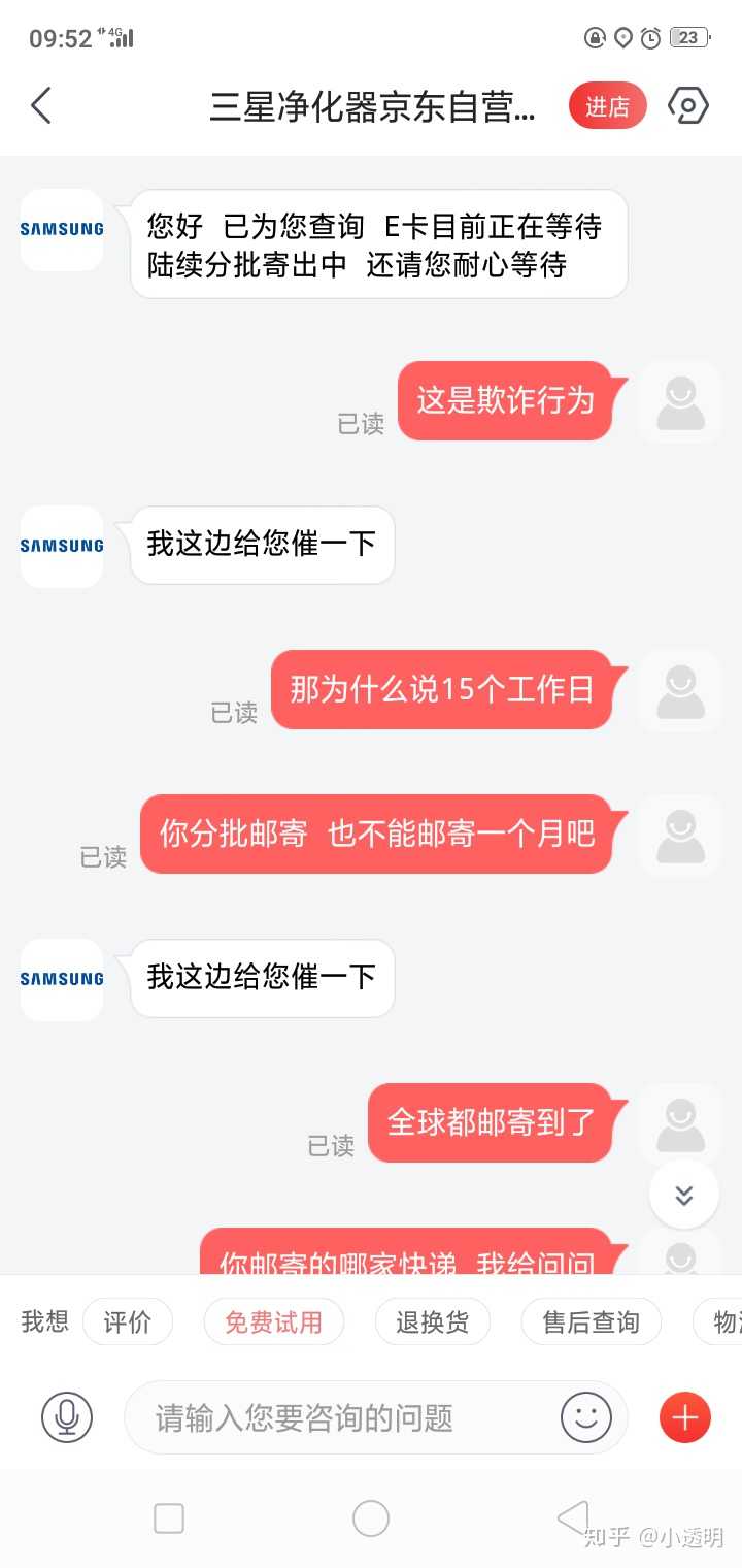 5月底在京东的三星自营店买了个净化器,说是晒单有500e卡,可以免费试用一年。为了500e 卡买了,6月3号收到货联系客服登记,说是15个工作日发货,一直到今天7月1号 ,问客服,只会说帮你催,有多少人遇到跟我一样的问题,店大欺客?就这垃圾净化器,不知道是哪一年的库存,几百块钱的东西都比这个好吧!我贪小便宜1950买的,现在500e 卡遥遥无期,更不要想一年后免费退货了吧!有多少人跟我一样进坑了,一起维权吧!各位知友帮我顶起来,让更多人看到,不要再被骗了。