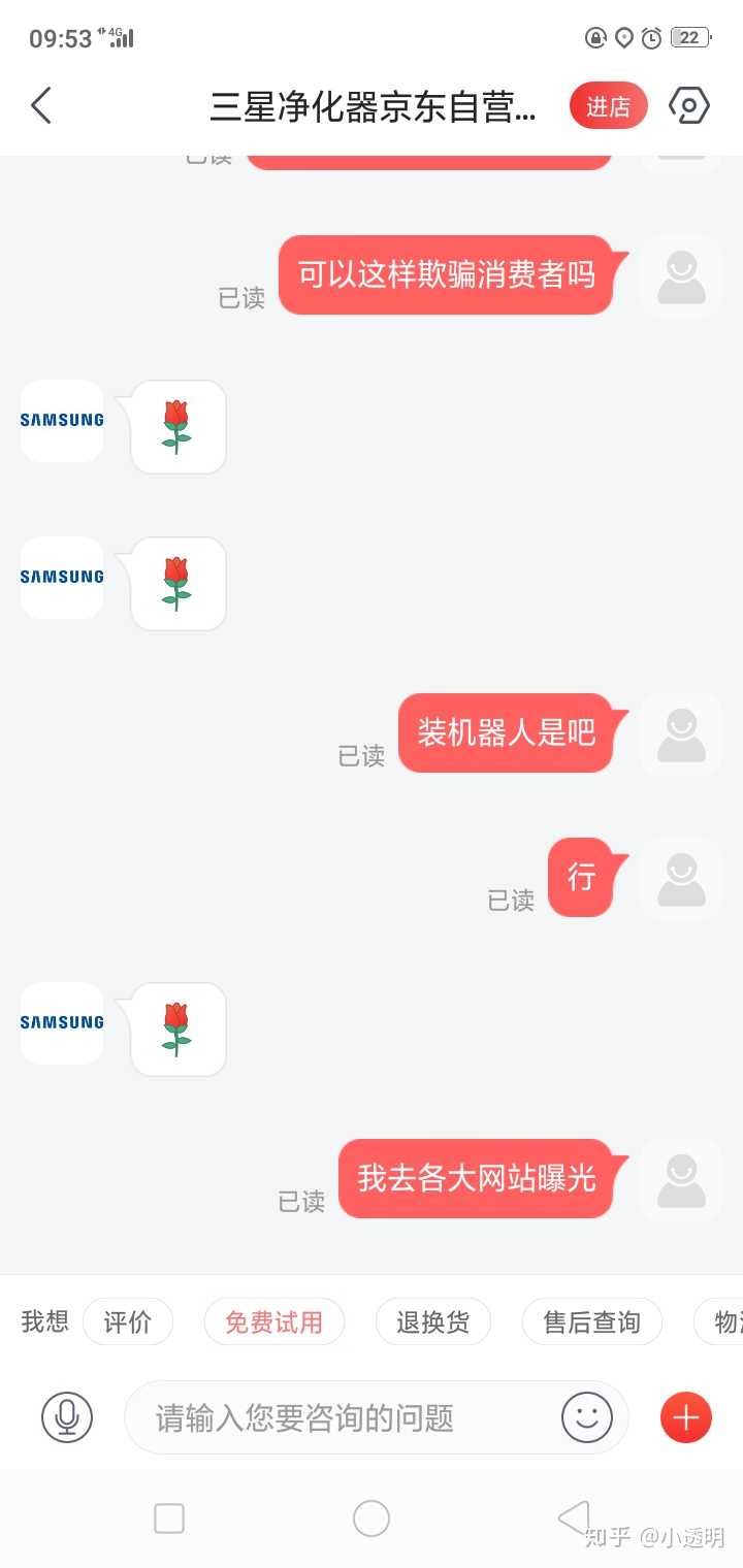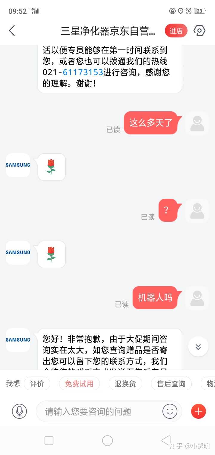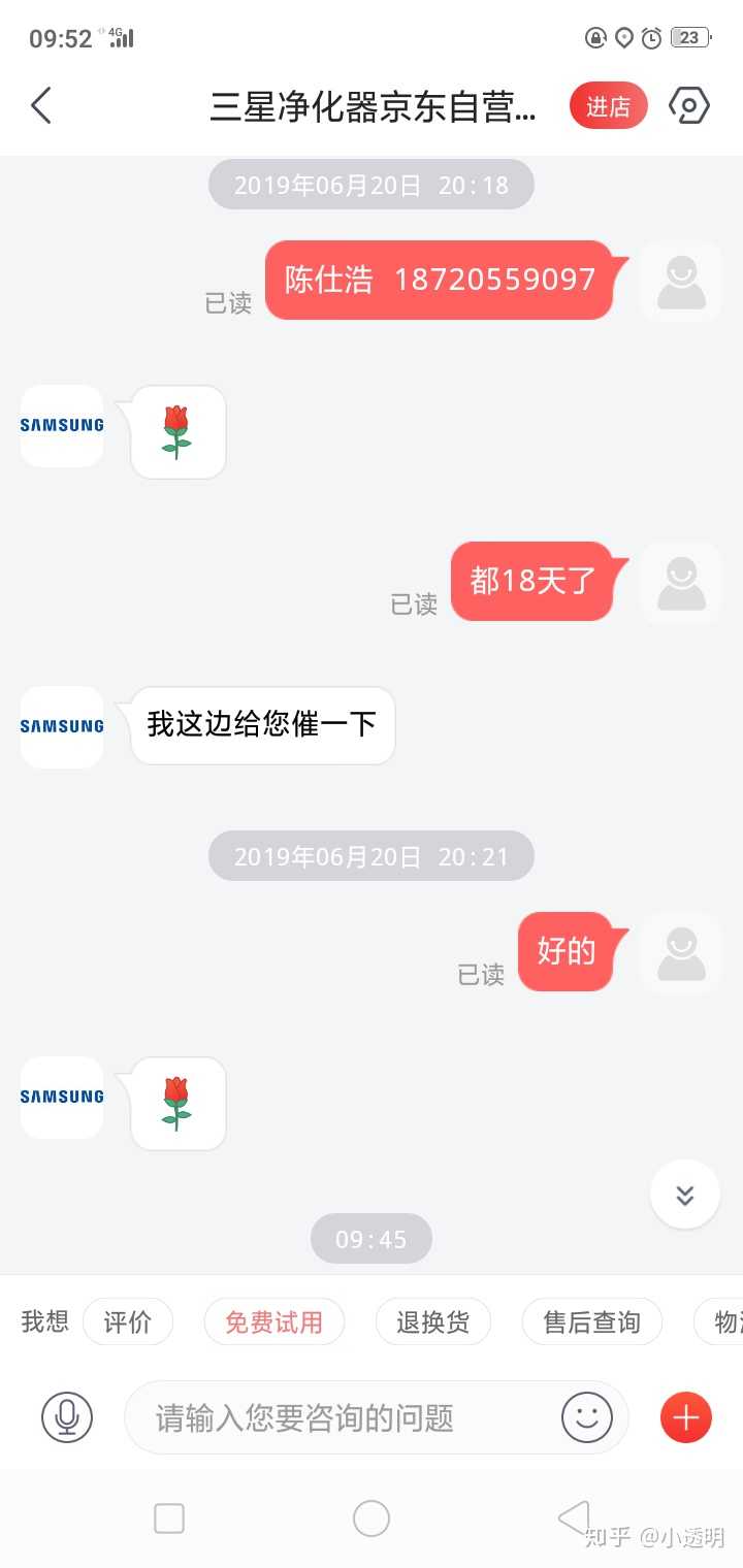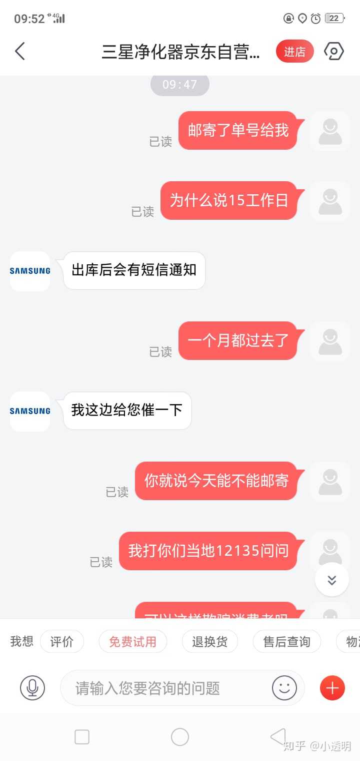5月底在京东的三星自营店买了个净化器,说是晒单有500e卡,可以免费试用一年。为了500e 卡买了,6月3号收到货联系客服登记,说是15个工作日发货,一直到今天7月1号 ,问客服,只会说帮你催,有多少人遇到跟我一样的问题,店大欺客?就这垃圾净化器,不知道是哪一年的库存,几百块钱的东西都比这个好吧!我贪小便宜1950买的,现在500e 卡遥遥无期,更不要想一年后免费退货了吧!有多少人跟我一样进坑了,一起维权吧!各位知友帮我顶起来,让更多人看到,不要再被骗了。