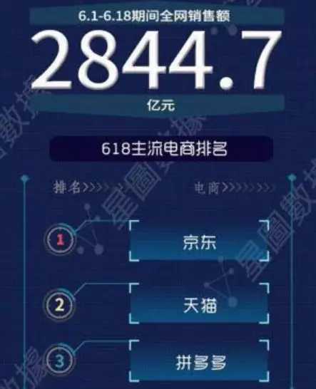 根据星图数据公布的全网销售额数据显示,在2018年618为期18天的活动期间,全网电商平台总销售额达2844.7亿元。其中京东618累计下单金额达1592亿元,超越天猫成最大赢家。拼多多取代苏宁闯进TOP3,后来居上成为最大的黑马。