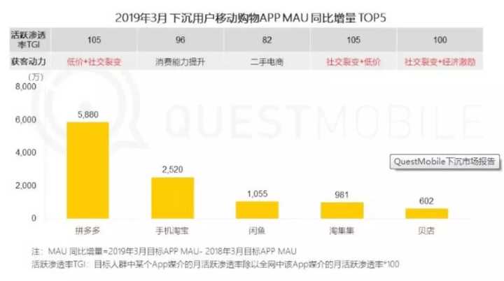 在今年5月Quest Mobile发布的《下沉市场报告》显示,2019年3月,领跑下沉市场月活增量前四的互联网应用分别为抖音、快手、支付宝、拼多多。其中,作为电商代表的拼多多获得了5880万净增下沉月活用户,是手机淘宝的2.33倍,是闲鱼的5.57倍。