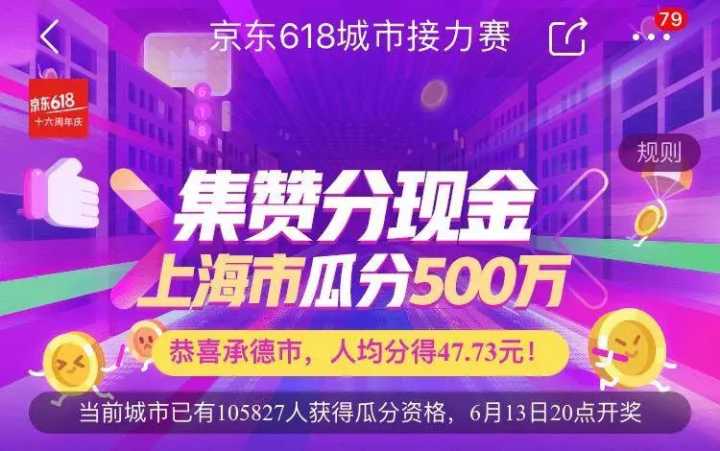当用户根据规则集赞成功后,即可获得平分红包的资格。在这场活动中,很多非三四线城市都成了覆盖对象,京东对于打入下沉市场已经表现出密切的关注与需求。这种引导用户提供城市定位的方式,有助于京东建立下沉地区的大数据库,从而能够更细致的分析人群的喜好,做出更有效的推广策略。