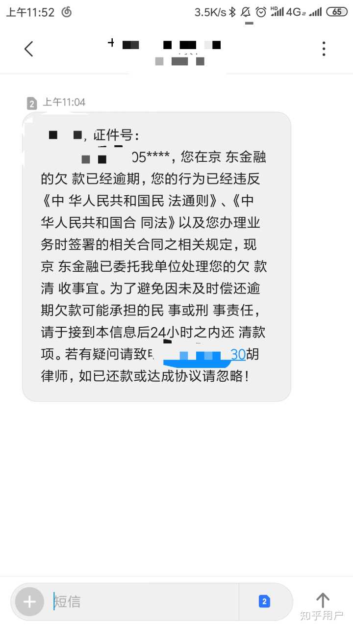 3. 京东白条不还就会收到这样的短信哦,这手机号是我新办的卡,每天都会收到京东金融的短信,我也打电话说明这手机号的主人和欠款人不是同一人,但还是孜孜不倦的给我每天一短信…我也不再反抗了,爱谁谁吧…