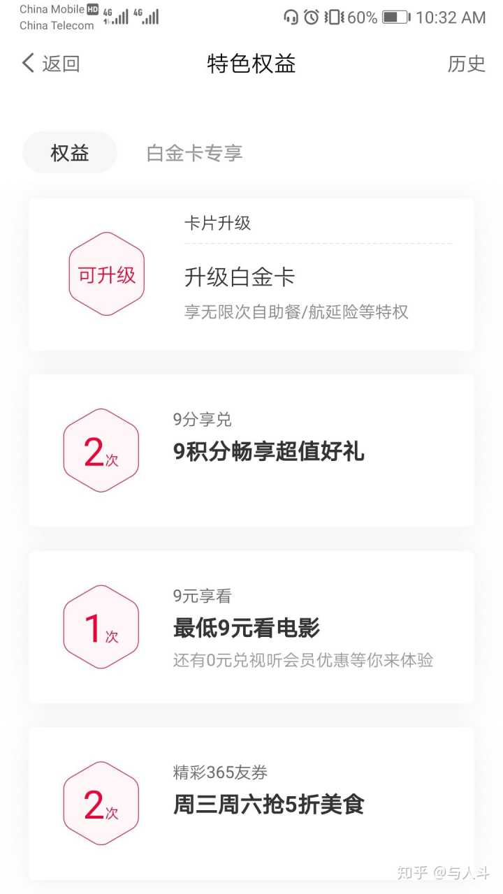 还有更变态的。使用中信白条信用卡每刷满三次299,获得一次九分享兑活动(可使用中信信用卡的九个积分兑换星巴克大杯饮品,哈根达斯单球等等,可选项目很多,答主记不清楚了),还有每刷满多少,获得一次九元享看活动(九块钱看一次电影,基本上所有电影院都可以用)。由于白条刚开始推出时,十二期免息活动特别多,免息产品也特别多,真的造福了像答主这样的一群受众。每次买东西都分期,还款期限超长不说,还能经常利用积分吃哈根达斯,喝星巴克。作为学生党的屌丝答主真的是彻彻底底的薅了一次羊毛。中信信用卡可以获得的权益如下图:(之前没有缩水的时候,权益更容易获得)