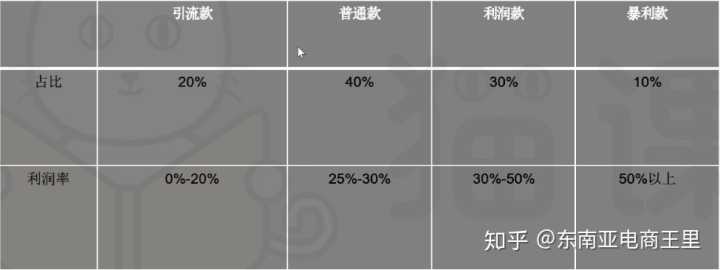 我们可以将我们店铺的产品分为引流款、普通款、利润款、暴利款。比方说我们想要店铺整体利润在30%左右,那我们可以做一个产品款式的布局把利润分布一下。