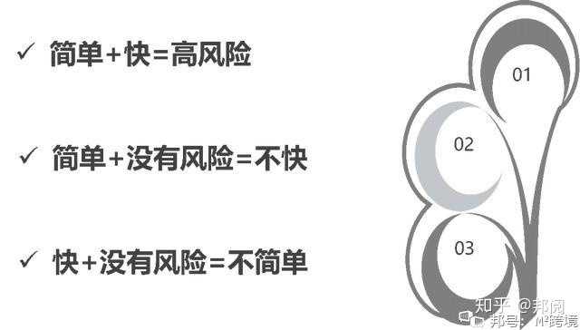 第三种,快+没有风险等于不简单什么意思,就是说如果您想让产品销量很快,而且没有侵权的风险这就意味着什么这个事情不太简单,你需要花费很大的经历去调研,去研究,要有想法,有创意,有区别做到这些是不简单的