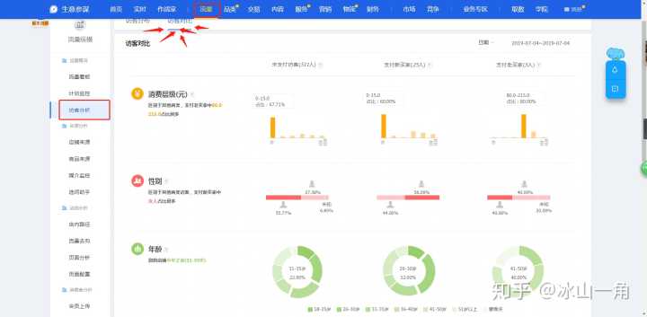 可以通过卖家后台,生意参谋-流量-访客分析-访客对比,可以了解到店铺访客的消费层级、性别、年龄,以及主要的地域分类人群等。