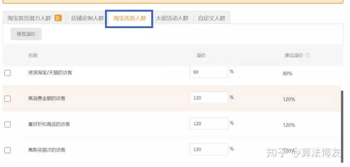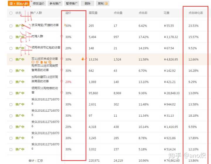 如果单个人群的点击率比其他人群的点击率低,roi低,可以把这个人群的溢价降低,或者是暂停这个人群的投放,投放一段时间之后,投产比较好的人群可以加价5%,这样就有了更多的几率把产品展现给这部分人群,在观察一段时间后在进行调整。
