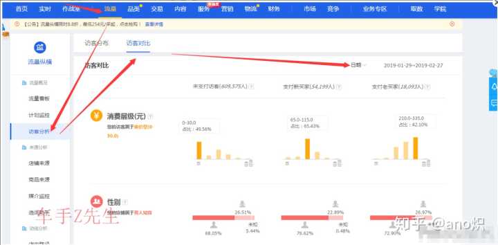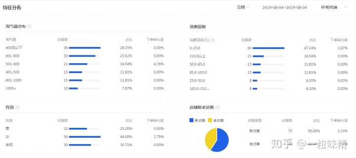 4. 有两个地方可以看自己店铺的人群标签,一个是生意参谋-流量-访客分析,可以大致看到:顾客的淘气值分布,消费层级,店铺新老访客占比,访客性别,他们来源的流量分布,以及Top关键词等。