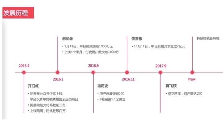 拼多多走的是高性价比策略,跟淘宝属于错位竞争,争夺的是同一批用户的不同场景。拼多多的成功我觉得最关键在于一个“拼”字,拼这个字,让有意愿购买的客户口口相传,通过各种社交工具传播,把信息孤岛连接起来,获得了现在各大平台最最看重也是赖以生存的基础—“流量”。