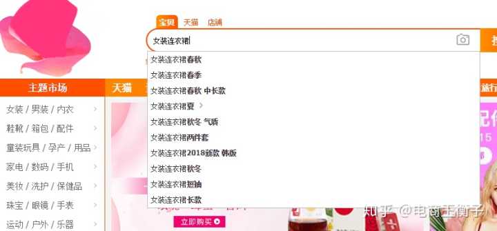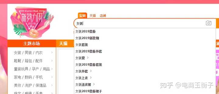 打开淘宝搜索页面,在搜索框如数我们的类目词,比如: 女装