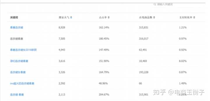 我们单品的核心权重关键词先确定好了,接下来我们就要去关注和确定我们的长尾词,还是需要用到我们的生意参谋,把你确定核心关键词在上面的搜索框输入,然后选择7天的数据 点击相关搜索词,我这里举例选择 连衣裙春夏 在搜索的时候选取4数据 搜索人气 点击率 在线商品数量 支付转化率