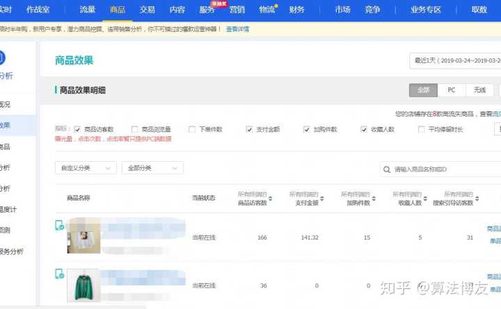那么怎么去看一个宝贝有没有流量呢?进入卖家中心打开生意参谋–商品–商品效果:
