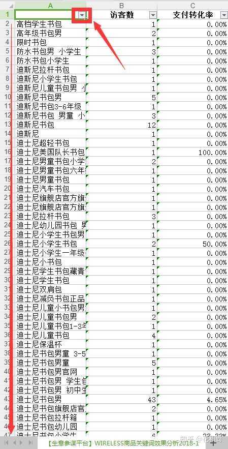 这样第一个字母相同的文字就会全部按照a、b、c、d、e…..有规律排在一起,方便查看关键词的引流效果,访客数、支付转化率同理。