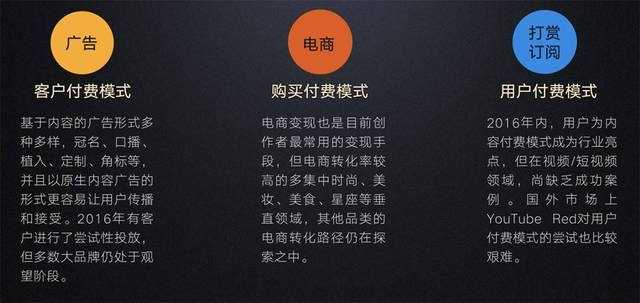 广告营销是短视频市场主要的商业变现模式,通过原生广告、互动广告、展示广告等多种营销方案的形式转化平台的内容和流量价值。除此之外,短视频+电商、用户付费都是基于短视频内容特点和交互特点进行最大化价值挖掘的商业模式。
