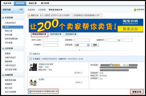 5、卖家选择物流失败后,可以重新登录到“卖家中心”—“发货”—“等待发货的订单”,在具体的订单后点击“重新发货”即可。