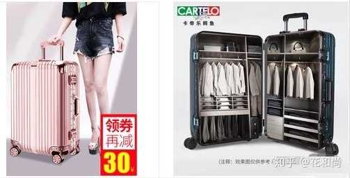 看这两张图,你会点击哪一张。当你的同行都是用箱子的外观的时候,你的主图做成,一个箱子打开,像2个柜子里面装好整齐的衣服,体现的是一个行李箱的大容量。