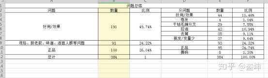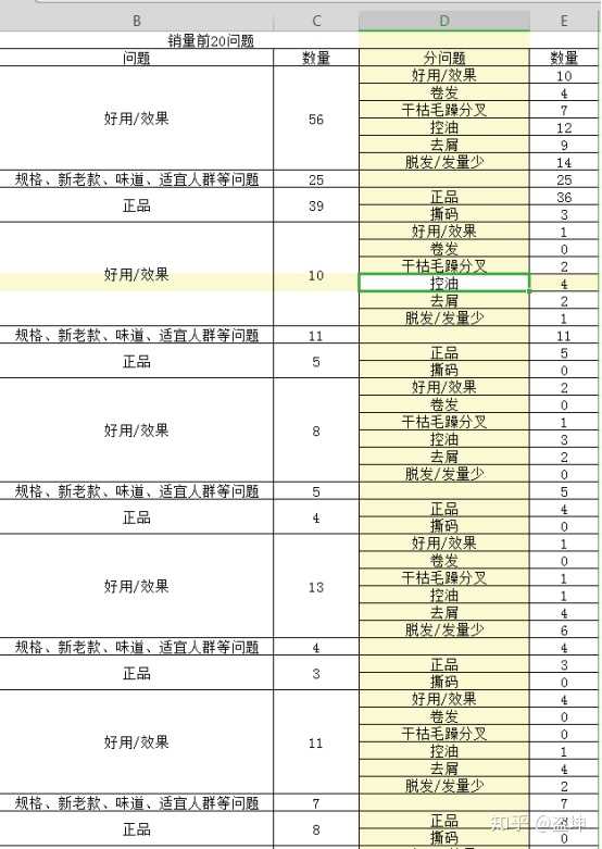 下图就是我们对一个洗发水问大家的调查,通过调查,我们可以发现大家最在意的就是洗发水的效果,尤其是去屑、控油、干枯、毛躁、分叉这五大类问题。其次是正品问题。最后就是关于产品新老款规格以及适用人群等。