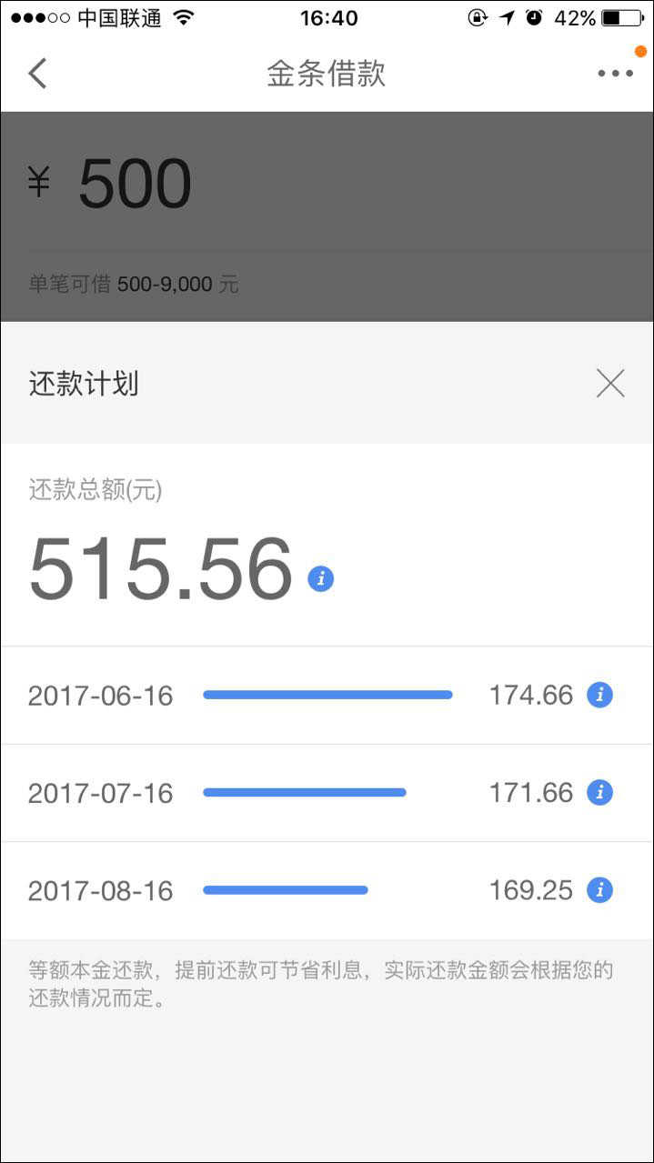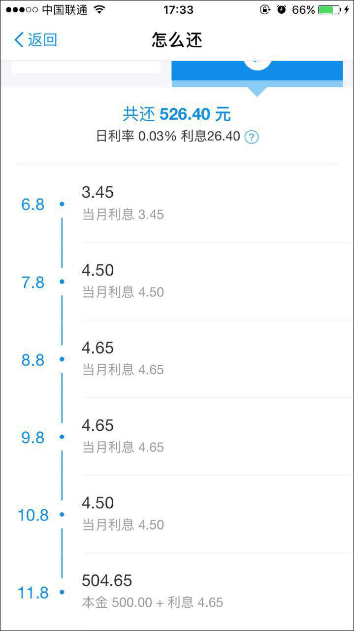 例如,5月16日月付宝宝在蚂蚁借呗借了500元,期限是6个月(只有6和12个月可选)