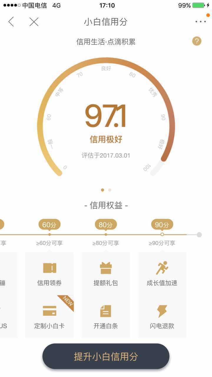 我是白条重度用户,但感觉京东显然没阿里有钱啊,我的白条才15300左右,金条是36000,如果换成阿里,是不是花呗和借呗也会很高?