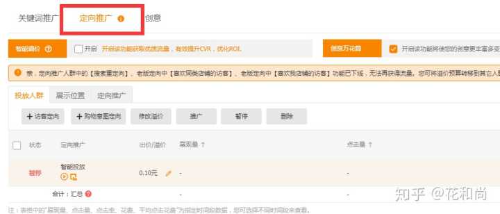 做好这些之后就开始选择要推广的关键词了,这里就不细说了,但是要注意选择的关键词一定也是产品标题里面有的。这些都做好之后先关闭定向推广,然后去开启人群推广。