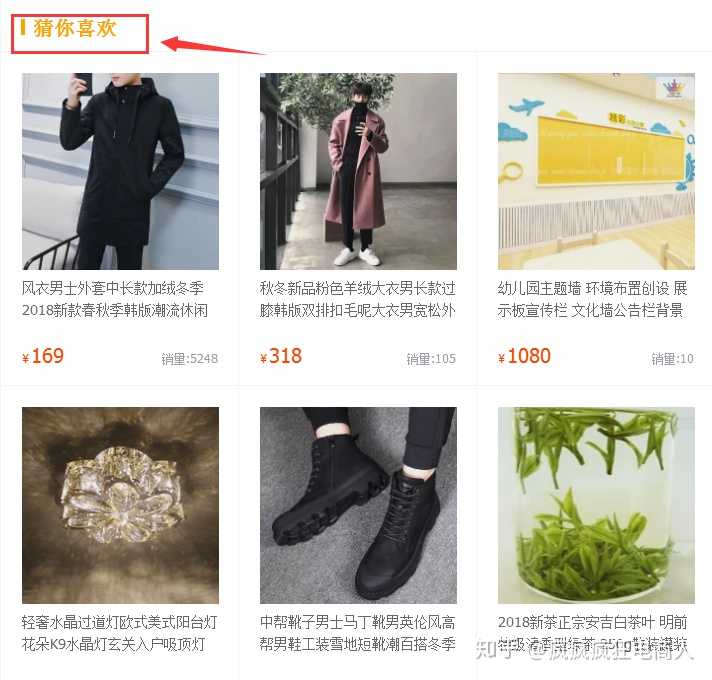 跟消费者当前需要相关的,你最感兴趣的商品——比如冬天天气冷了,你可能需要一件羽绒服。然后你以前喜欢购买的都是韩版的衣服,中低价位,那么符合要求的羽绒服,就有可能出现在“猜你喜欢”的版块里。当然如果你以前在某店铺买过衣服,这店铺恰好上新羽绒服那么他出现的几率要更高。