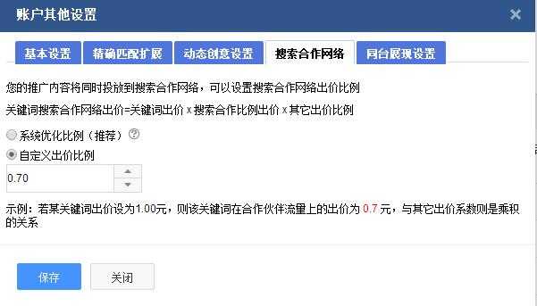 百度合作流量是比较神秘的存在,在凤巢后台可以直接操作。有个设置范围,最低是0.7的出价比例。如果要全部关闭,是需要跟百度客服说,他们会通过百度总部关闭。