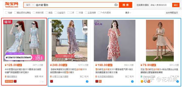 例如搜索“连衣裙 雪纺”,可以看到红框为“付费展现”,篮框为“免费展现”。