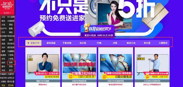 将6000万商品信息根据商品属性分成23个会场,每个会场再用相应的分录手段把优质商品进行组织。以微鲸电视为例,被分配在家电会场,该会场以非抢不可、超级满减、洗衣机、空调、冰箱等维度进行二次分类。