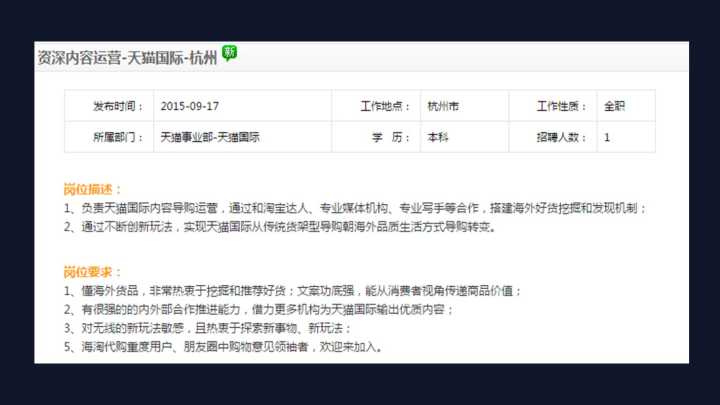 秉承这对天猫内容运营瞻仰与对同类的负责,于是我到它的招聘官网寻觅解开天猫运营的正确姿势的钥匙。(ps,了解一个企业的工作内容,最简单粗暴的手段就是撸它的招聘官网)