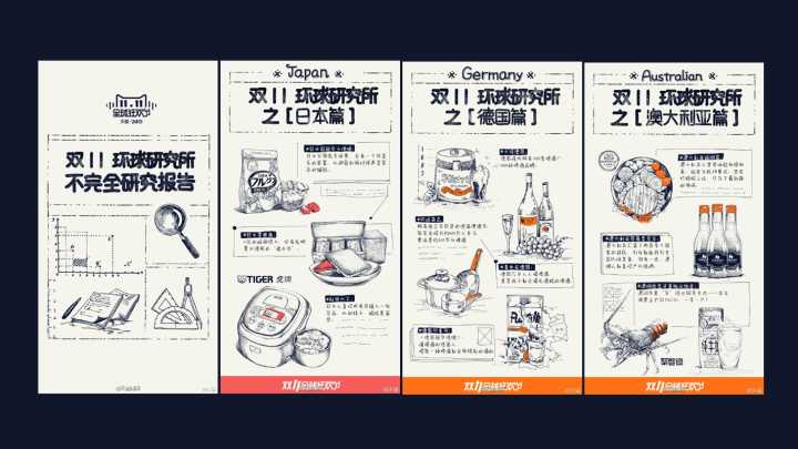 1)手绘。天猫在10月21-10月31日的10天里每天推荐一个特色国家主题,涵盖了各国家和地区的吃喝玩乐,并且在结束将11个国家的特色商品制作成手绘版的《双11环球研究所,不完全研究报告》