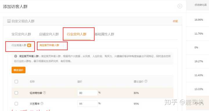 先来说系统人群,比如淘宝首页潜力人群,店铺定制人群,淘宝优质人群,部分类目更新后还有一个叫行业定向人群 (里面又细分为行业高潜人群和淘宝首页种草人群),这部分人群的重要性不言而喻,从下图的字面意思我们就可以看得出来,当你宝贝没有乱标签的时候,在这类相关的人群溢价帮助肯定是非常大的。