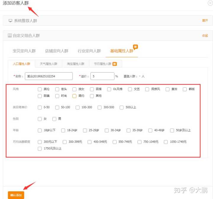 选取一级人群或者二级人群(这个要根据覆盖人数来看,小类目标品的话,一级人群就够,大类目非标品的话,可以先勾选到二级人群上。)