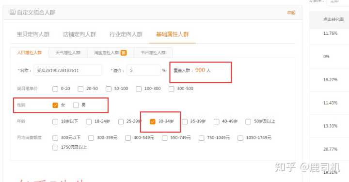 再有就是我们的自定义人群,自定义人群主要就是年龄、性别、单笔消费、月均。气候等(部分类目还有风格。母婴儿童相关类目,还有孩子性别年龄)。这部分类目是属于细分化的类目,需要我们自己去调整设置,正常来说一般类目也就能到二级人群覆盖人数就会非常少了。