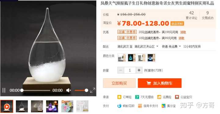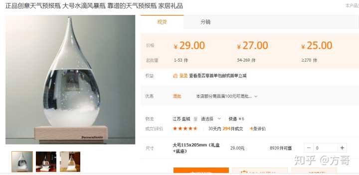 首先我们要搞清楚电商宝贝最终售价背后的定价逻辑,搞清楚一个宝贝的成本结构,这样方便我们拆分一下价格,举个例子,我们在淘宝搜索引擎键入关键词“天气瓶”,找到如下宝贝: