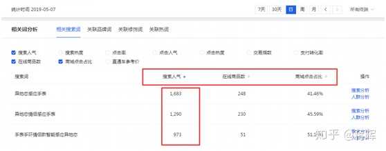 搜索人气代表着这款产品在市场的搜索量;在线商品数不难理解,就是目前淘宝上宝贝数量;商城点击占比代表品类竞争的难易程度,占比多的代表天猫店多,天猫多,市场大。