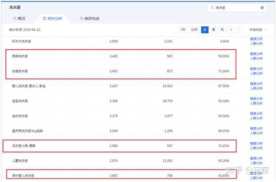 还是不难发现,更加细分的产品。比如“好爸爸洗衣液”“洗衣液小瓶 便携”,甚至 “蓝月亮洗衣液3kg包邮”。(洗衣液品牌门槛不高,所以也可以作为中小卖家选择细分的一个方向。其他类目要灵活筛选关键词)