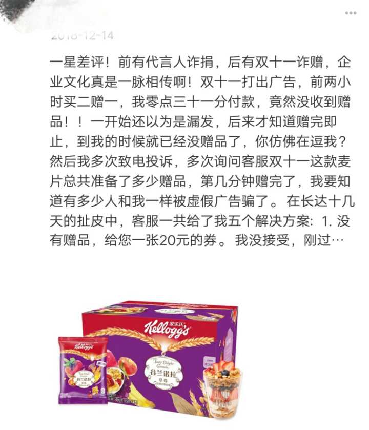 一星差评!前有代言人诈捐,后有双十一诈赠,企业文化真是一脉相传啊!双十一打出广告,前两小时买二赠一,我零点三十一分付款,竟然没收到赠品!!一开始还以为是漏发,后来才知道赠完即止,到我的时候就已经没赠品了,你仿佛在逗我?然后我多次致电投诉,多次询问客服双十一这款麦片总共准备了多少赠品,第几分钟赠完了,我想知道到底有多少幸运儿能收到赠品。