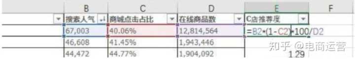 C店推荐度=搜索人气*(1-商城点击占比)*100/在线商品数