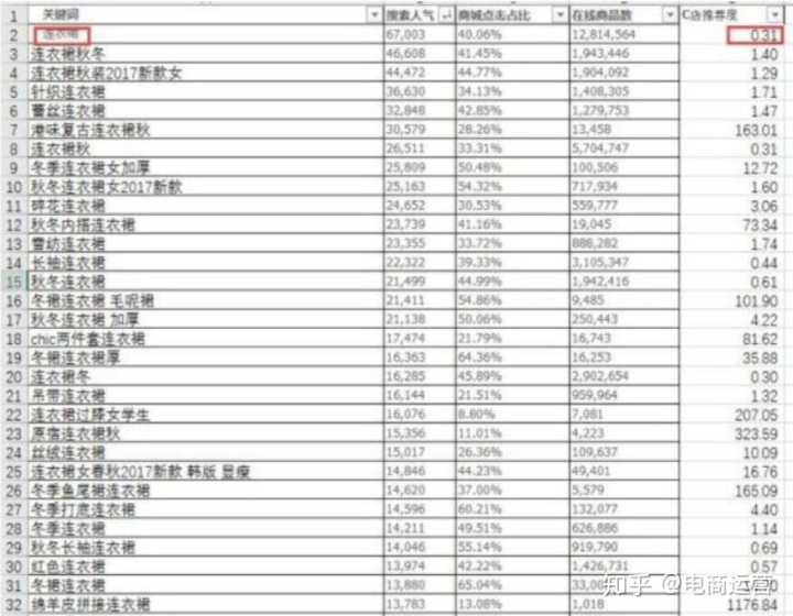 可以看到,最大的词,“连衣裙”一天的搜索人气有6W,但这样的词并不适合中小卖家,因为它的C店推荐度只有0.31.