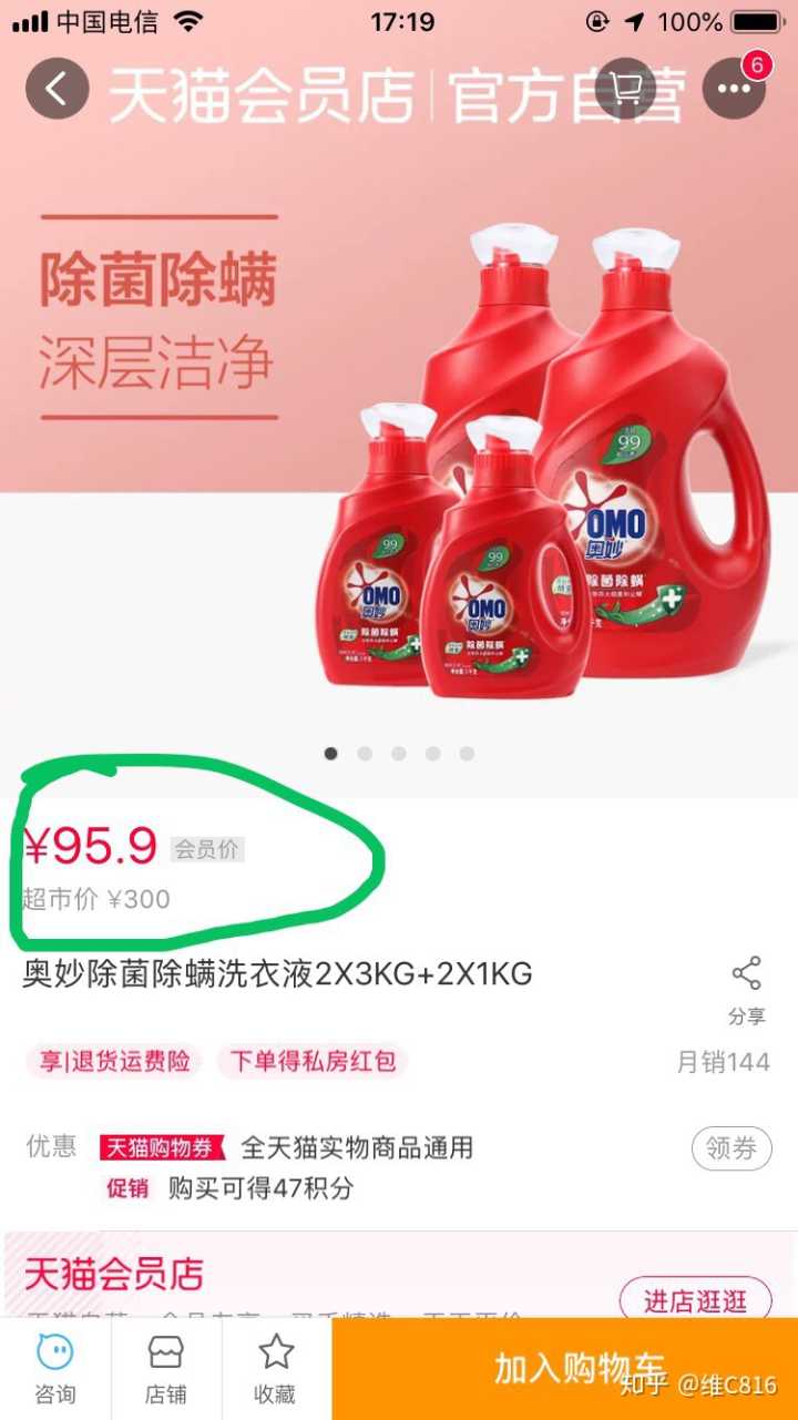 2. 不值得,如下图,看起来会员价95.9比天猫超市的300优惠得多,可是哪个消费者花300买8公斤奥妙洗衣液,线下超市也没这么离谱的价格,95.9本应该是合理的价格。