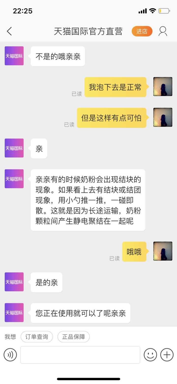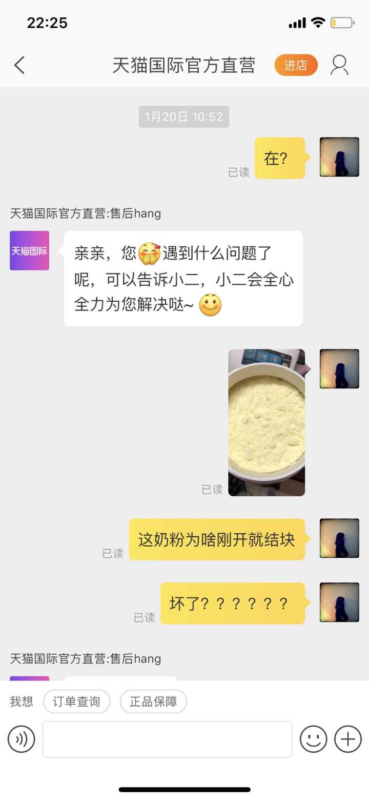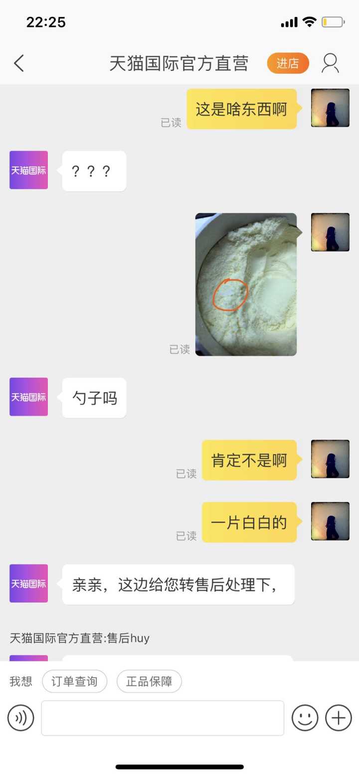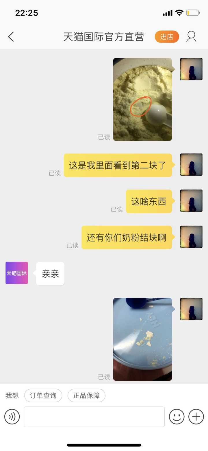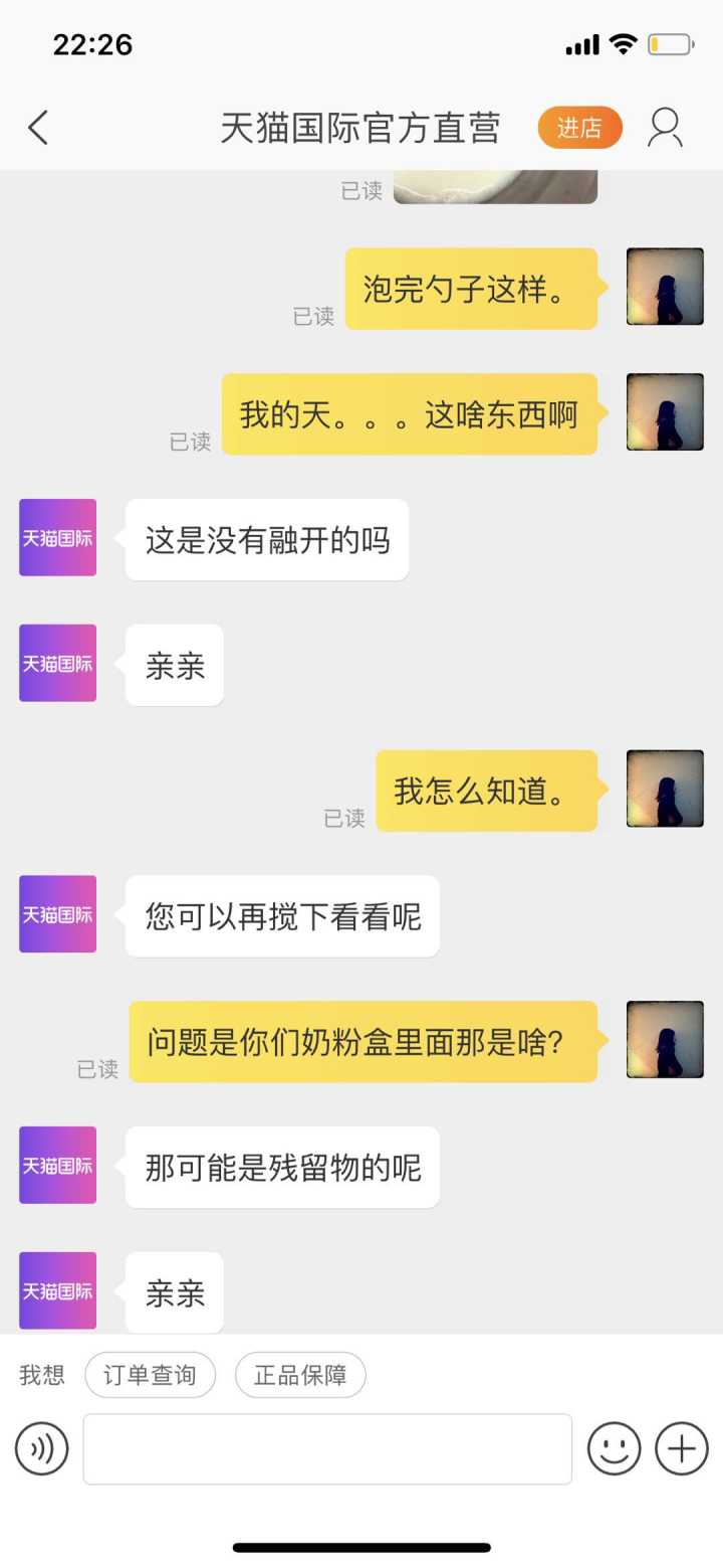 6. 天猫国际官方直营店出售变质产品,我买了一瓶牛奶里面出现结块,客服告知我属运输导致静电而成,不影响饮用,因此我没在意。等到1月26日我在泡奶粉的时候发现里面有不明物体,立即联系商家,商家回复我这是他们包装操作不当导致的!然后当天晚上我肚子疼腹泻,隔日就诊肠胃炎!