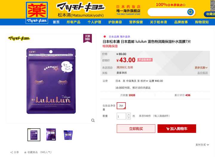 另外有一些产品呢确实是要贵过海外價格比较多的,比如松本清售卖的这一款面膜,我6月的时候去日本大概是500日元左右,按当时汇率应该是25元人民币左右。但好在满299包邮啊!而且松本清和天猫的招牌在这,我是觉得其实很有价格优势的。更不用说这么小的东西,很多代购都不愿意代。而从日本邮多的东西回来还很可能被税,这里的税松本清已经承担了。