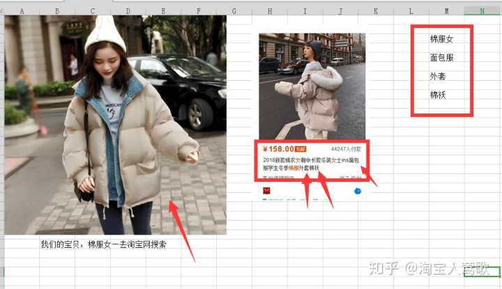 1)首先我们要确定核心词,我们的宝贝能叫什么名字?如果你不知道,你可以去淘宝搜索某一个核心词,看看我们的同行都在使用什么词,根据宝贝图片,我们用”棉服女”为案例,搜索后发现同行们都用的是,棉服女,面包服,外套,棉袄等,