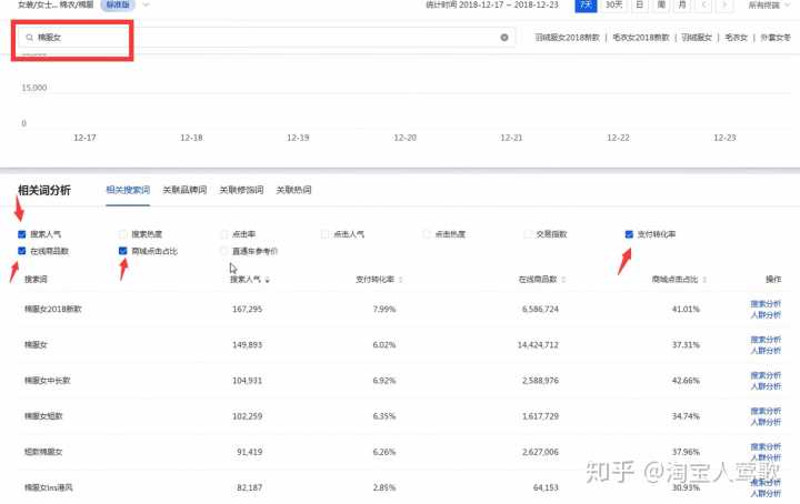 从搜索结果中可以看出羽绒服女 中长款韩版搜索量更高,以此类推,一个一个进行验证。