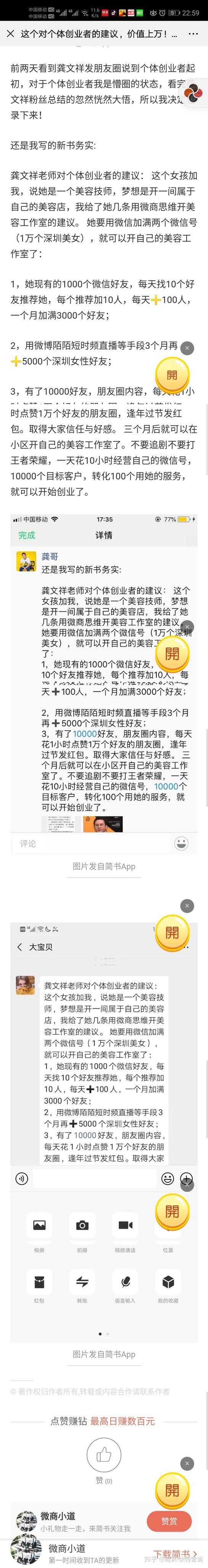 上面提到各种渠道啊,大部分还是引流到微信,所以大家在做的时候都要去考虑引流量,用户到微信后,就要去分析有多少潜在用户(目前有很多软件可以分析,需要私我),去看看那些人自己是可以拓展的,是自己的潜在用户,那就可以进行针对性运营,主动促成用户成交。