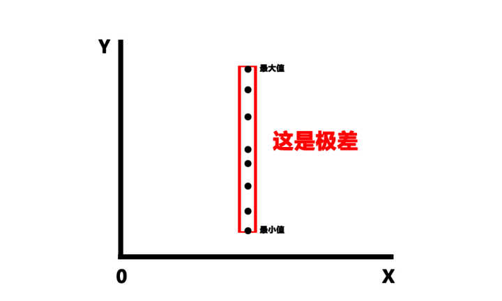从公式来看,最大值和最小值都很好理解,以前在Excel当中是用max()函数求最大值,min()函数求最小值。最大值-最小值=极差。如果我们把最大值和最小值放在一个直角坐标系上去看的时候,就可以发现所谓的极差,其实就是两者之间的直线距离。
