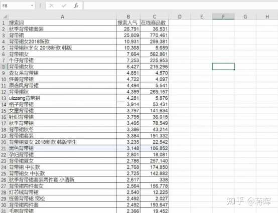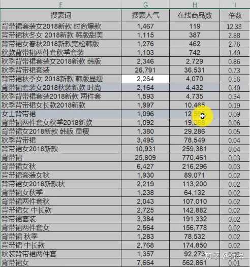 然后建立一个Excel表格,将背带裙相关的搜索结果都复制到表格,尽量多整理一些,强调一下,一般大类目一个词语单天的搜索人气尽量不要低于1000,极限的话,我认为是500。但是对于一些大类目,词语特别多的话,你会发现这个值可以稍微放大些,没有绝对的标准。