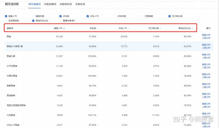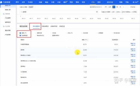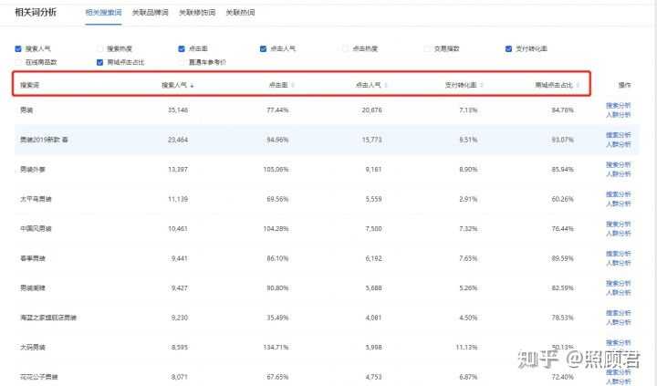 通过关联词可以看到很多相关的推荐词,以上红框的指标,是我们下一步筛选词组将要讲到的。